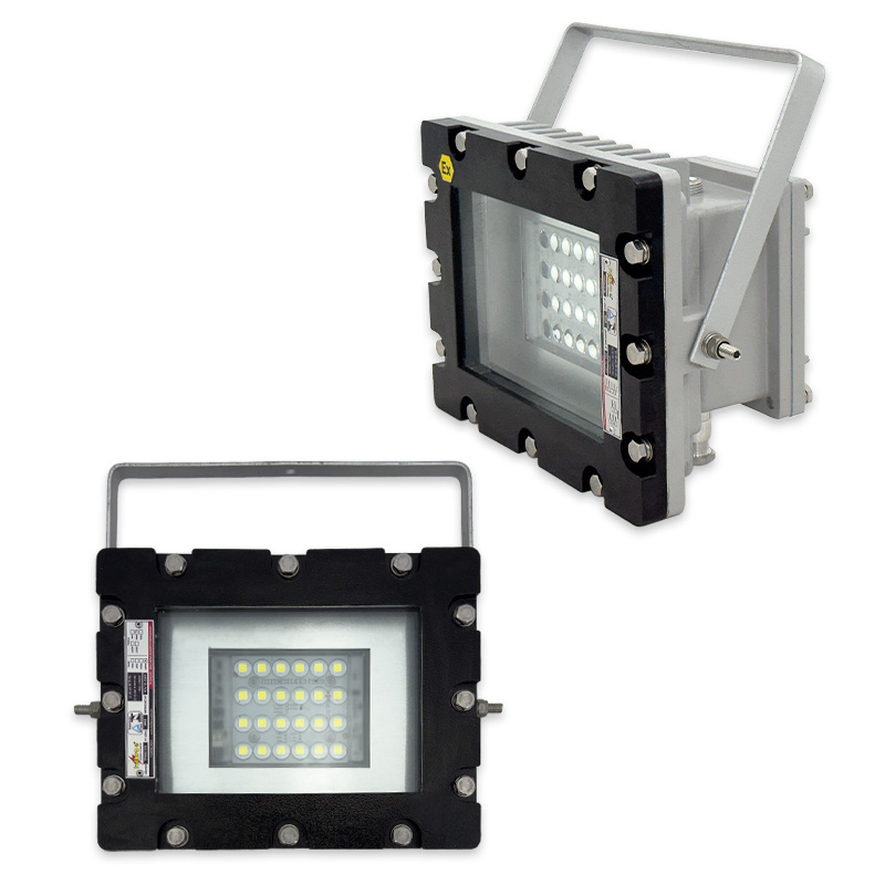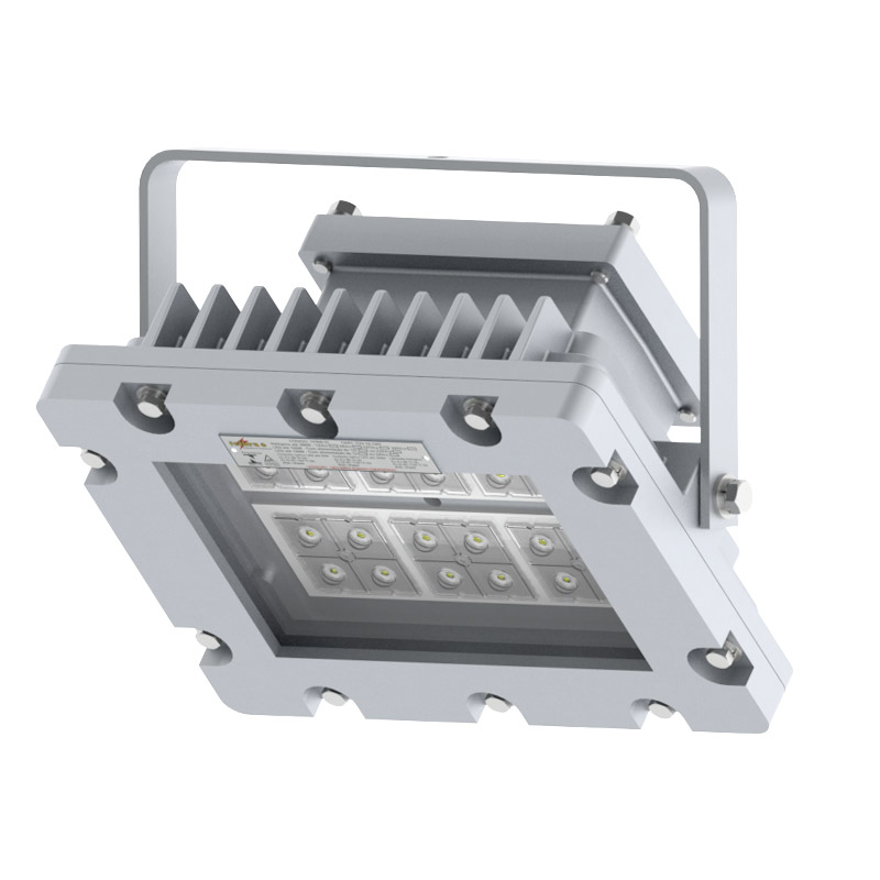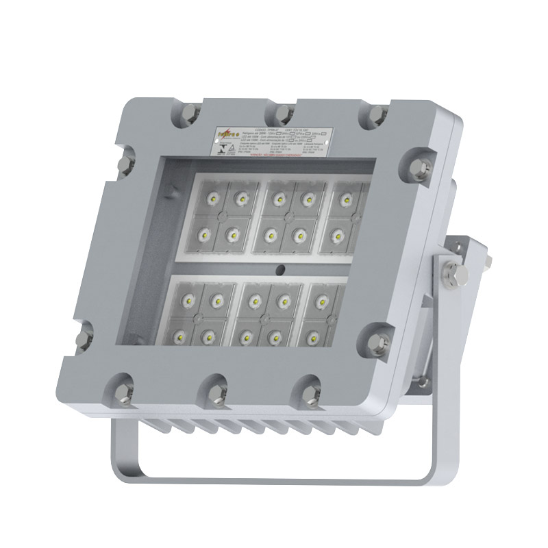 Projetor à prova de explosão e à prova de ingresso de poeiras combustíveis, fabricado em alumínio fundido ou aço inox 304, 316 3 316L (sob consulta) vidro plano temperado, conjunto fornecido com placa de LED´s de alto desempenho e durabilidade até 100W, fornecido com invólucro segurança aumentada, prensa-cabo e suporte tipo ”U” para fixação e ajuste vertical e/ou horizontal. Utilizado na iluminação de áreas classificadas como Zona 1, 2, 21 ou 22, grau de proteção IP66. TPRW37B