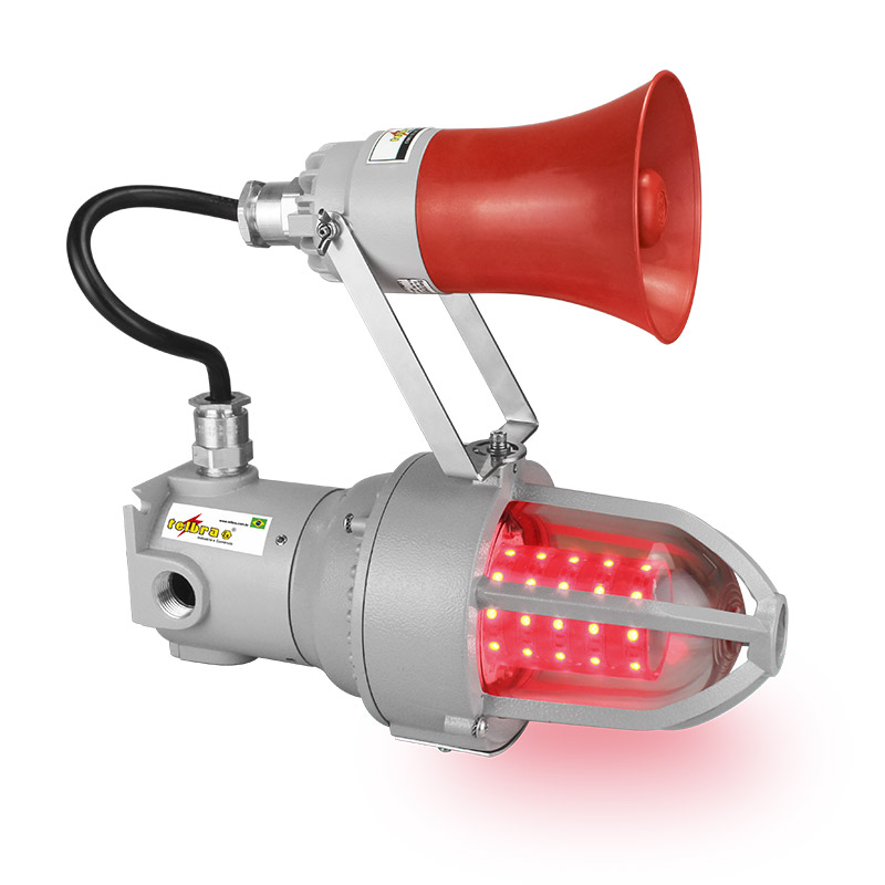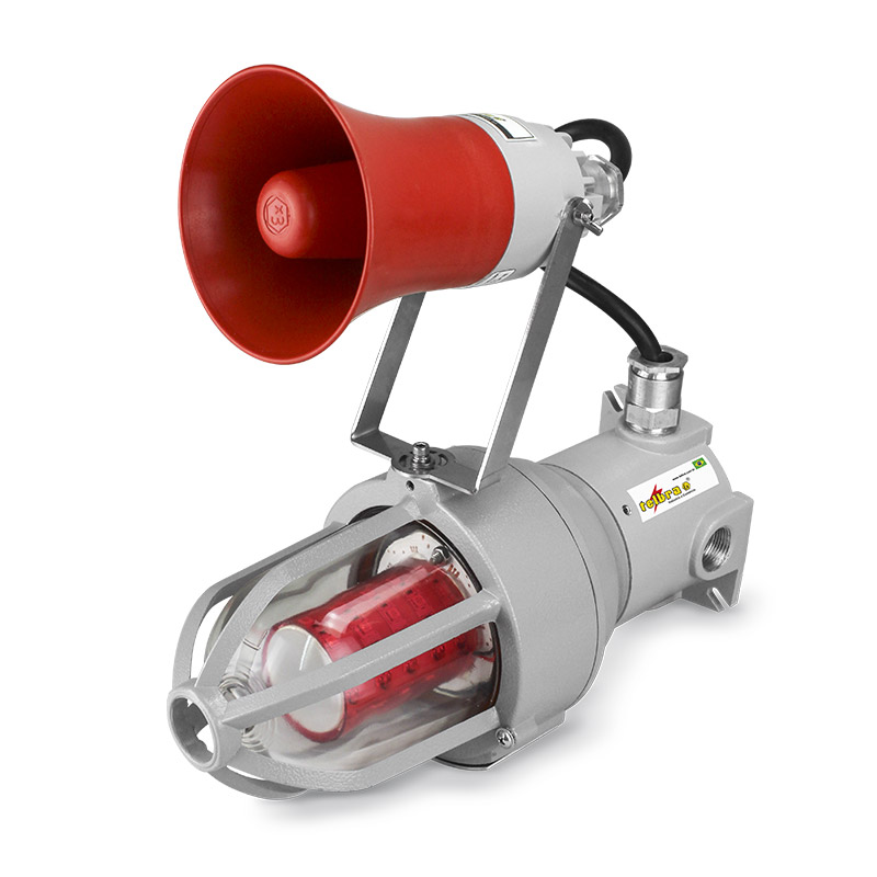 Sistema audiovisual de emergência Ex db (á prova de explosão) Ex tb (á prova de ingresso de poeiras combustíveis), para atmosferas explosivas e áreas industriais, apropriada para uso em Zona 1, 2, 21 ou 22, Corpo e grade fabricados em liga de alumínio fundido copper free de alta resistência mecânica e à corrosão, globo de vidro em borosilicato, alta transparência e resistência a impacto e choque térmico, sirene com Intensidade sonora de 105 dB (a 1 metro), fornecido nas tensões de 24Vcc, 110Vca ou 220Vca.