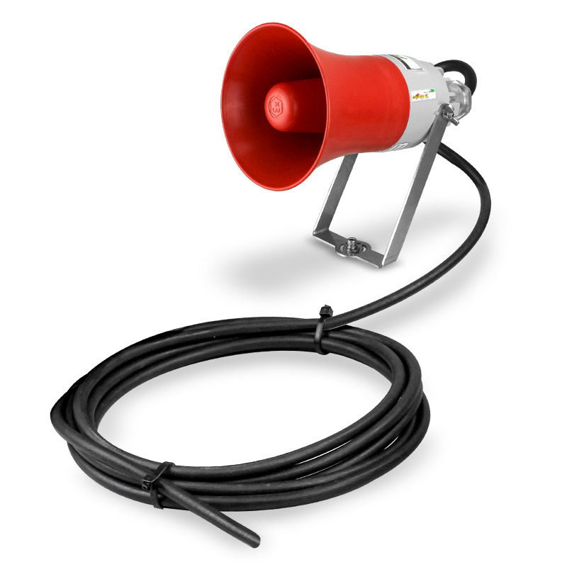 Características: Sirene eletrônica, para atmosferas explosivas e áreas industriais. Ex db (á Prova de Explosão), Ex tb (à prova de ingresso de poeiras combustíveis), grau de proteção IP65, fabricado em liga de alumínio fundido copper free de alta resistência mecânica e à corrosão, tensão de alimentação de 12Vcc, 24Vca/cc, 110240Vca/cc, intensidade Sonora (105 dB a 1 metro), podendo ser fornecida com suporte de fixação, com roscas NPT / BSP ou Métrica.