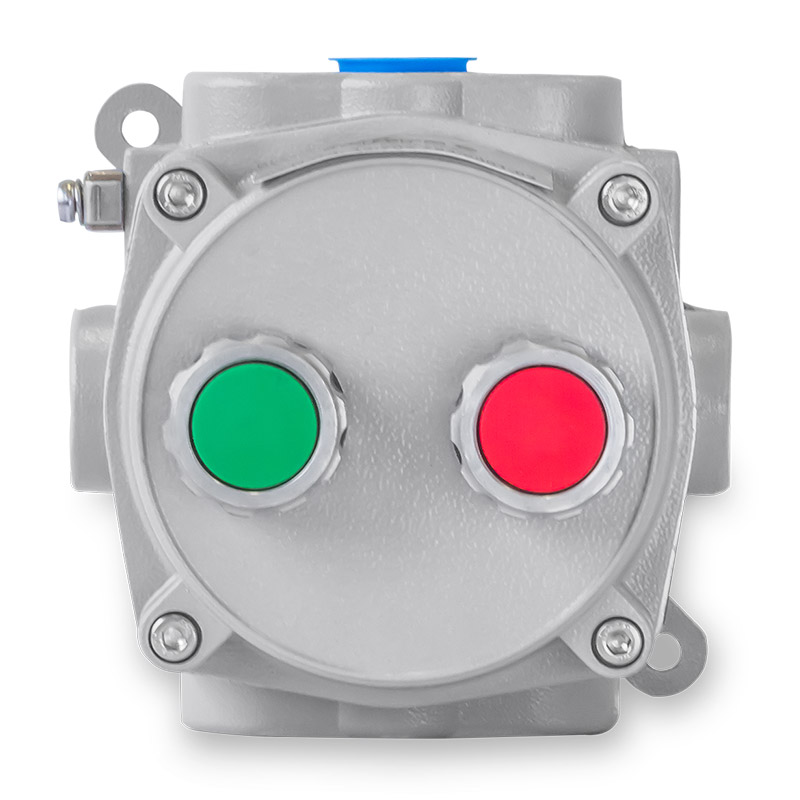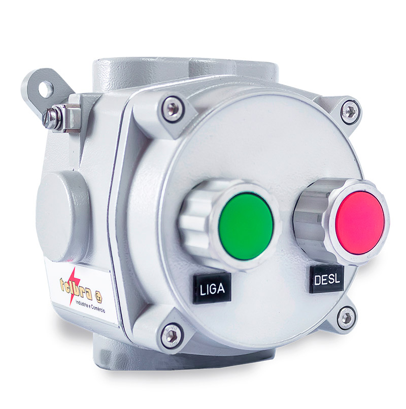 Invólucros Simples com tipo de proteção Ex d, fabricadas em liga de alumínio, acabamento em pintura eletrostática cinza claro Munsell N6,5. Conjunto montado com componentes Ex d de comando e/ou sinalização como:Botões de Emergência; Botões de Impulso; Chaves de comutação; Sinaleiros; Potenciômetro; Botão Iluminado, fornecido com entradas roscadas B-H-3/4”NPT (Outras sob encomenda). Fornecido com terminal para aterramento externo. Tipo de proteção gases: Ex db Zonas 1 ou 2 grupos IIA, IIB , IIC Tipo de proteção poeiras: Ex tb Zona 21 ou 22 grupos IIIA, IIIB, IIIC. Grau de proteção IP66