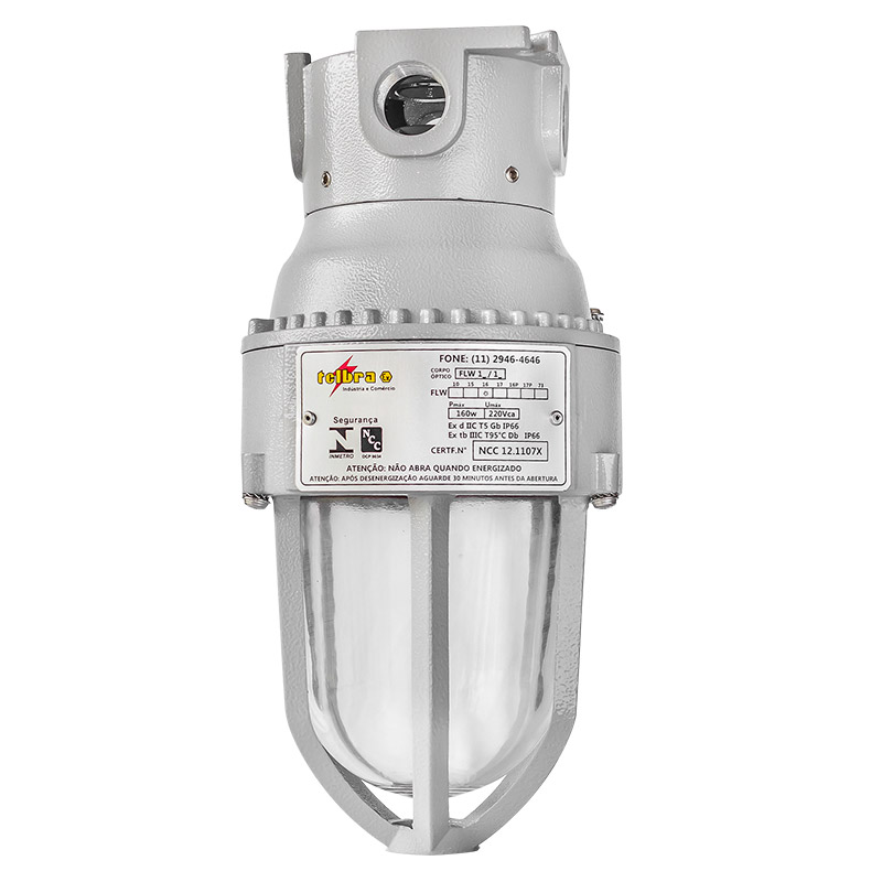 Luminária Ex d à prova de explosão, instalação plafonier, corpo, grade e acessórios em alumínio fundido com acabamento em pintura eletrostática cinza claro Munsell N6,5, vidro boro-silicato. Entrada roscada 3/4”NPT, ponto para aterramento externo, porta-lâmpadas E-27 ou E-40. Utilizado na iluminação de áreas classificadas em industrias como: químicas, farmacêuticas, de processo, fertilizantes, armazéns com líquidos ou pós combustíveis. Para potências entre 7W a 250W halogenas, msita, led ou fluorescentes compactas. Tipo de proteção gases: Ex db Zonas 1 ou 2 grupos IIA, IIB, IIC Tipo de proteção poeiras: Ex tb Zona 21 ou 22 grupos IIIA, IIIB, IIIC. Grau de proteção IP66