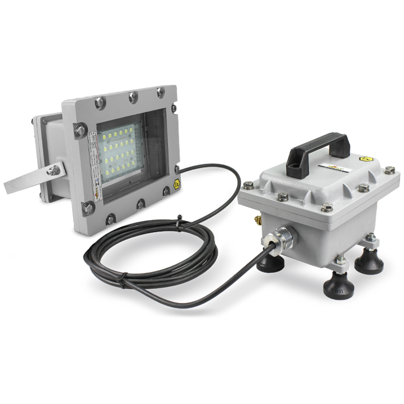 Sistema de iluminação para áreas confinadas em locais com atmosferas explosivas. Zona 1, 2, 21 ou 22, Ex db IIB T6 GB // Ext b IIIC T85ºC Db, IP66. Atende normas ABNT NBR IEC 60079-0; 60079-1; 60079-31; 60529. Conjunto composto por: Projetor Ex db até 50W 24Vcc; Invólucro Ex db contendo: Fonte 220Vca-24Vcc; Disjuntor; Prensa-cabos e cabos PP entre luminária/projetor e invólucro; Prensa-cabo e cabo PP entre Invólucro e plugue (não fornecido). Pode ser fornecido com plugue Ex sob encomenda. O invólucro com equipamento auxiliar fornecido com alça e pés antivibratórios. Alumínio fundido ou aço inox 304, 316 3 316L (sob consulta)