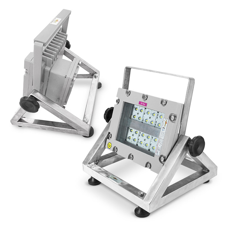 Fabricado em liga de Alumínio fundido ou aço inox 304, 316 3 316L (sob consulta), acabamento Munsell N6,5 Montado com LED de alto desempenho e durabilidade Conjunto fornecido com bornes Ex e “segurança aumentada” Fornecido com prensa cabo Ex ed (sob encomenda pode ser fornecido com cabo e plugue) Sistema portátil em estrutura de Alumínio ou Aço Inox Fornecido com pés tipo Vibra-Stop Pode ser fornecido para tensões 110Vca; 220Vca ou 24Vcc Em 24Vcc pode ser utilizado em áreas confinadas (NR33)