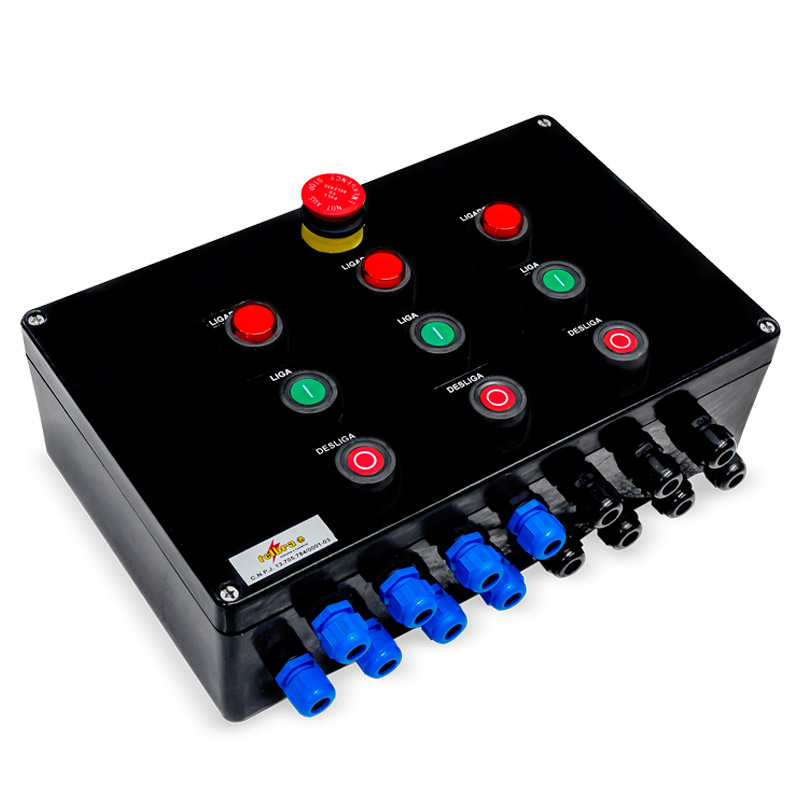 Comando e sinalização Ex eb (segurança aumentada) Ex tb (à prova de ingresso de poeiras combustíveis) apropriado para uso em atmosferas explosivas 1, 2, 21 ou 22, e áreas industrial, invólucro Ex eb fabricado poliéster, corpo e tampa fixado por parafusos de aço inox, fornecidos com componentes conforme especificação, junta de vedação em silicone, a pedido fornecida com terminal de aterramento externo, placa de montagem, prensa cabos e entradas rosqueadas conforme a necessidade do projeto. Utilizada em áreas classificadas, onde haja risco de explosão como indústrias químicas, petroquímicas, farmacêuticas, processamento de alimentos, tintas e vernizes, armazéns de materiais inflamáveis e poeiras combustíveis. Acabamento: Na cor natural preta.