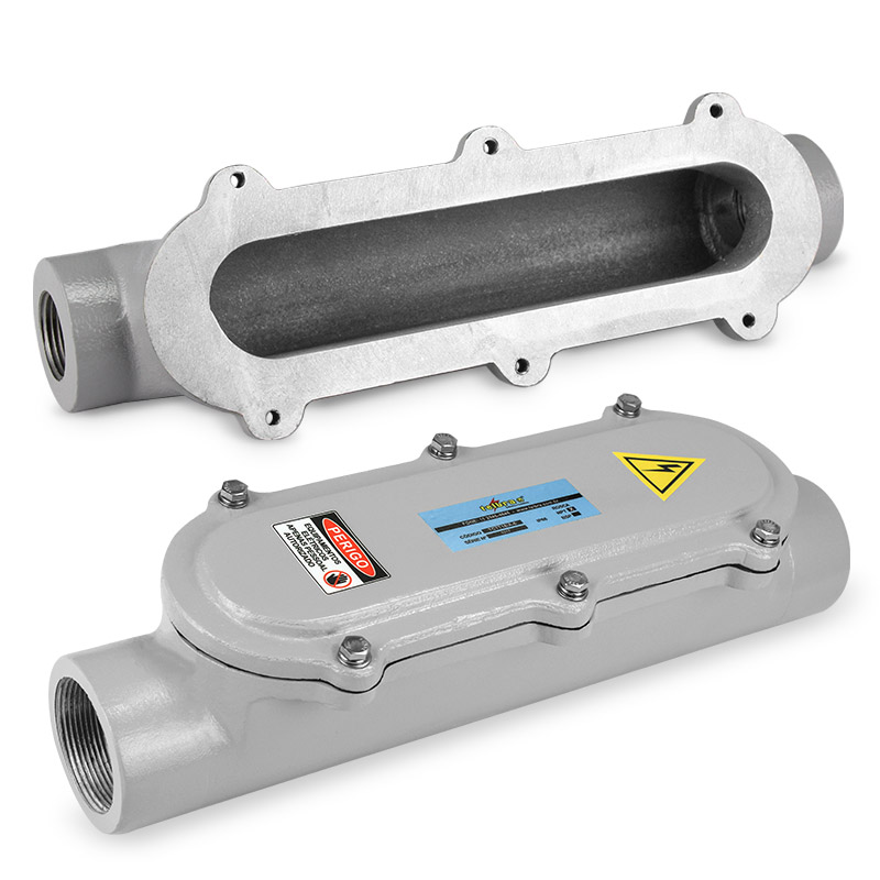 Cotovelo 90° (com tampa de inspeção) para atmosferas explosivas e áreas industriais, fabricado em alumínio fundido copper-free de alta resistência mecânica e à corrosão, podendo ser fornecido com roscas NPT ou BSP.