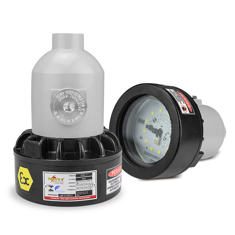 Características: Luminária Ex db “à prova de explosão” Luminária Ex eb “segurança aumentada” Luminária Ex tb “à prova de ingresso de poeiras combustíveis” Corpo em alumínio ou inox Difusor em vidro temperado Fonte de luz em LED´s ONBOARD Fornecido com involucro segurança aumentada com bornes Ex e Pintura eletrostática na cor cinza claro Fornecido de 10w a 120w Alimentação 12/24Vcc ou 127,220Vca Dois tamanhos diâmetro 140mm ou 200mm Fluxo luminoso 2.800lm a 11.500lm Nível de segurança Db e Gb Aplicação Zona 1; 2; 21 ou 22 Grau de proteção IP66 / IP66W CT 5500K + 500