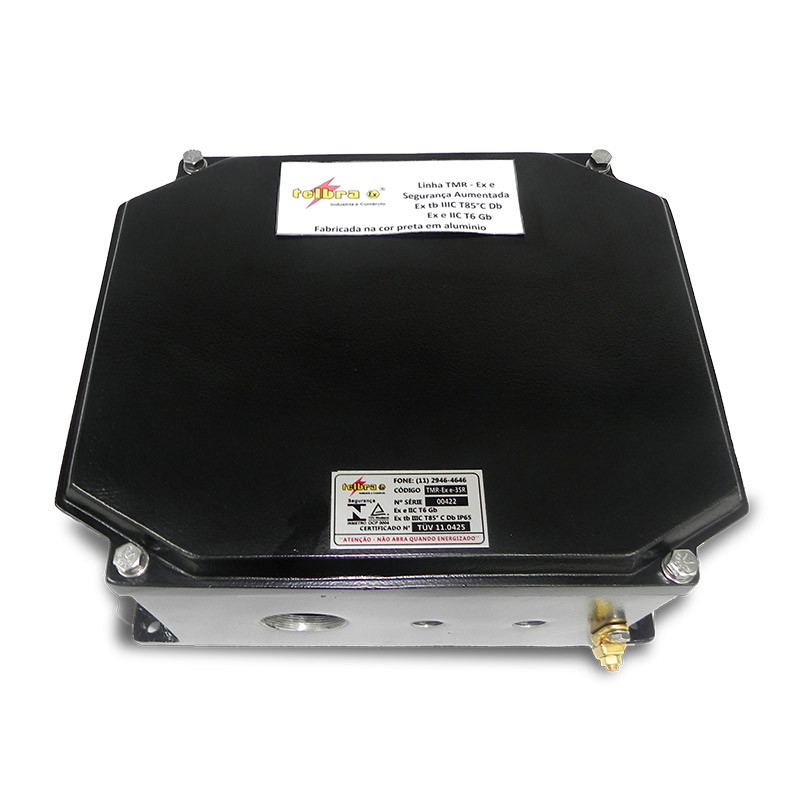 Características: Invólucro Junction-Box (com bornes), proteção Ex eb Ex ia ou Ex tb IP66/IP66W, para áreas classificadas ou industriais, corpo e tampa fabricado em alumínio fundido de alta resistência mecânica e à corrosão, acabamento em pintura eletrostática na cor preto Munsell N 1, placa de montagem (chassis) em chapa de aço galvanizada com acabamento em pintura eletrostática na cor laranja Munsell 5YR 6/14, orelhas de fixação reforçada, parafusos externos em aço inox 304, terminal de aterramento externo em latão. Entradas rosqueadas fornecidas conforme cada necessidade com roscas BSP, NPT, Métrica ou furos passantes. Aplicação: Indicada para ligação de condutores elétricos, em áreas classificadas como Zona 1, 2, 21 ou 22.