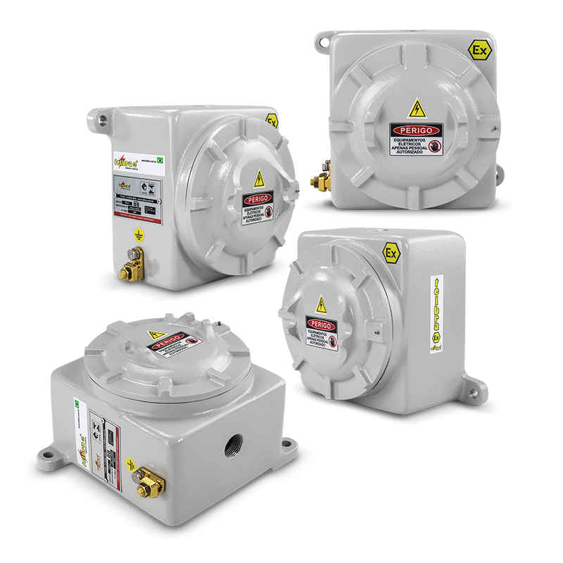 Características: Os invólucros para atmosferas explosivas, modelos TRW11V/*-*, com tipo de proteção “Ex db“ – (à prova de explosão), “Ex tb“ – (proteção por invólucro) e grau de proteção IP66W, são compostas de tampa e corpo roscados, tampa com parafuso para travamento allen em aço inoxidável 304/316, fabricadas em liga de alumínio fundido SAE 305/323, ASTM 356/359 ou aço inoxidável ANSI 304/316/316L. Aplicação: Utilizada em áreas classificadas, onde haja risco de explosão como indústrias químicas, petroquímicas, farmacêuticas, processamento de alimentos, tintas e vernizes, armazéns de materiais inflamáveis e poeiras combustíveis.