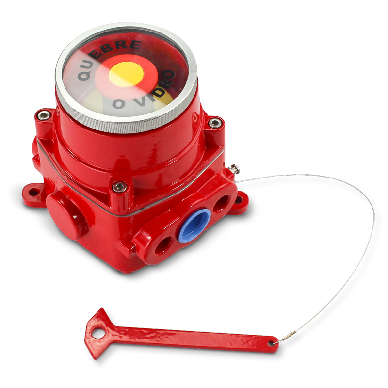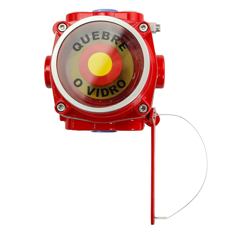 Características: Botoeira de emergência “Alarme Martelinho”, Ex db (á prova de explosão), Ex tb (á prova de ingresso de poeiras combustíveis) tipo quebra vidro, para atmosferas explosivas (Zona 1, 2, 21 ou 22) e áreas industriais IIP66), fabricado em liga de alumínio injetado de alta resistência mecânica e à corrosão, fornecida nos modelos: Automático, em caso de emergência, o operador quebra o vidro com o martelo e o botão é ativado automaticamente. Manual em caso de emergência, o operador quebra o vidro com o martelo e pressiona o botão, modelos fornecidos com entradas roscadas padronizadas B-H NPT, a pedido BSP ou Métrica.