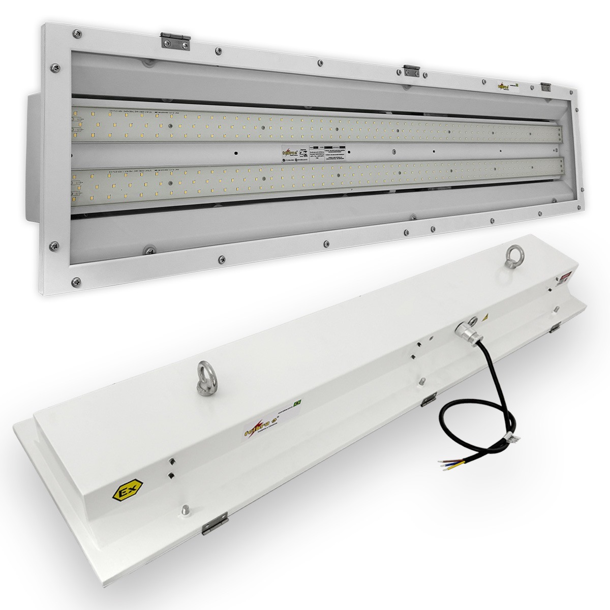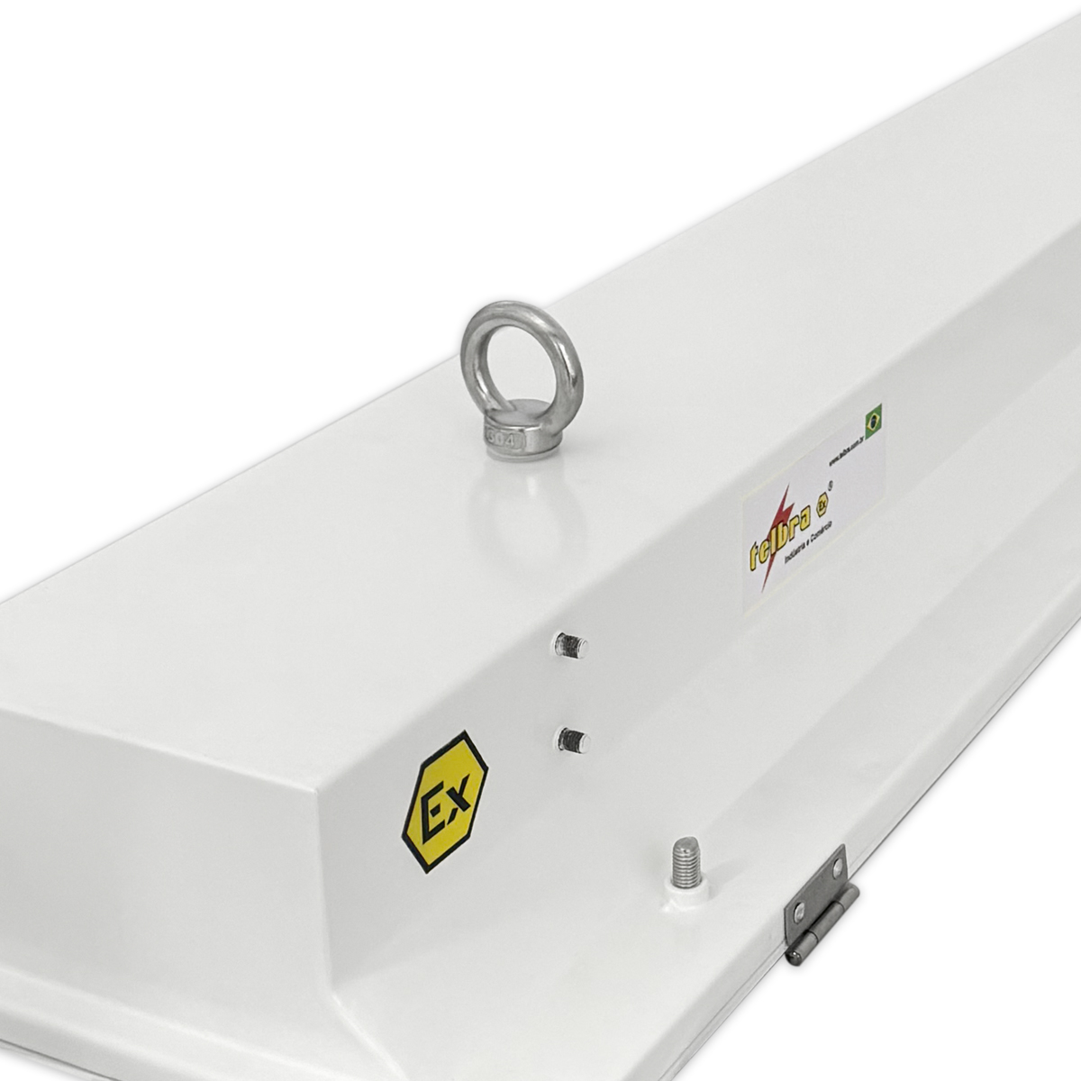 Características: Luminária de Embutir Fitas de LED, é uma luminária com diversos tipos de proteção Ex, sendo elas: Ex "e" (segurança aumentada), Ex d (a prova de explosão), Ex "m" (proteção de equipamento por encapsulamento) e Ex "t" (proteção de equipamentos contra ignição de poeira por invólucros). É composta por tampa com vidro, corpo de aço inoxidável 316, com acabamento em pintura eletrostática na cor branco.
