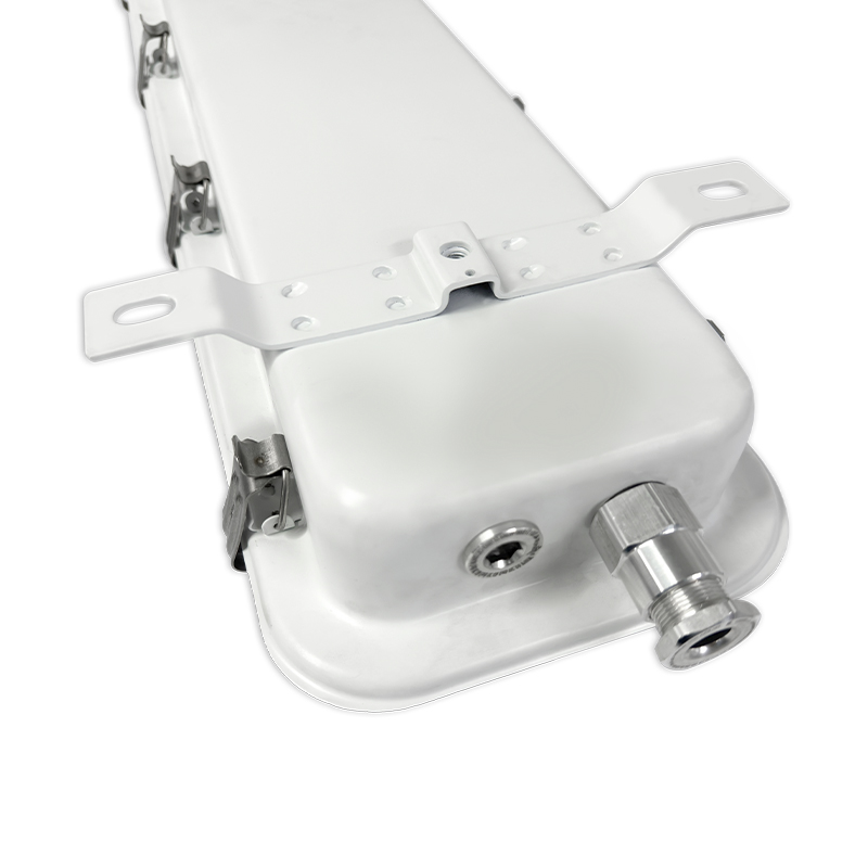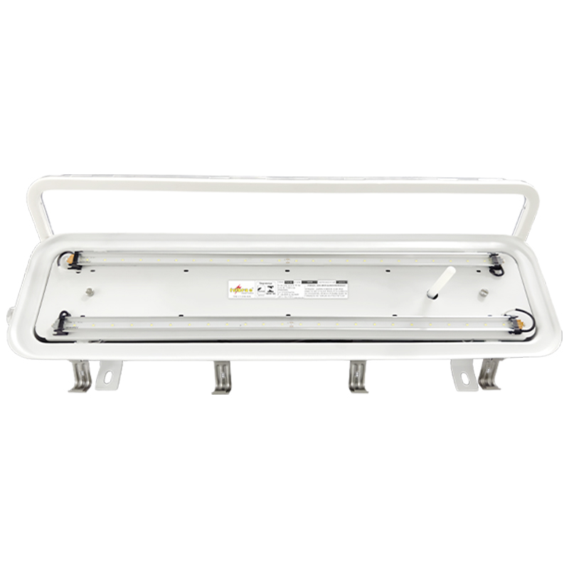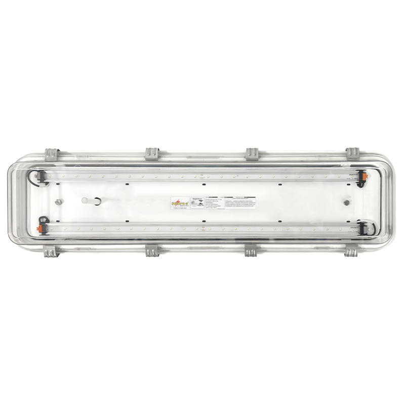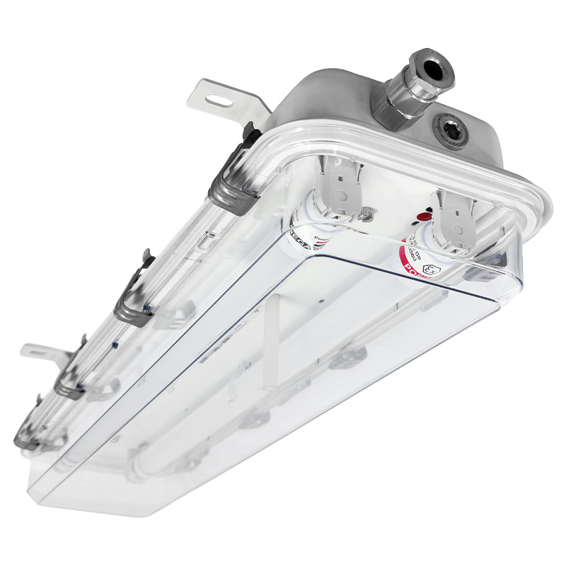 A luminária modelo TL**Ex/*-** É constituída de corpo em aço inox 316L. Possui difusor em policarbonato transparente, fechos em aço inox e junta de vedação em silicone, com acabamento em pintura eletrostática branca. Pode ser fornecida com sistema de emergência com baterias NiCd de autonomia de até 3 horas. Existem duas entradas de cabos em cada parede lateral do corpo de aço inoxidável, que são usadas para instalar prensa-cabos certificados (por padrão as medidas são M20 ou M25) ou bujões com tipos de proteções compatíveis.
