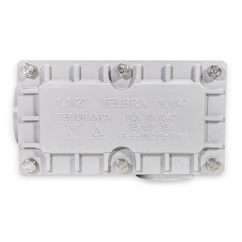 Características Construtivas Caixa de passagem à prova de explosão e à prova de poeiras combustíveis, fabricada em liga de alumínio fundido ou aço inox 304 ou 316, de alta resistência mecânica e à corrosão, tampa fixada ao corpo por parafusos de aço inox. Entradas rosqueadas de ½” a 4” NPT ou BSP. Acabamento Pintura eletrostática em poliéster de alta resistência à corrosão química, mecânica e à exposição solar, prolongando a vida útil do produto, na cor Cinza Munsell N6,5, (outras cores sob consulta).