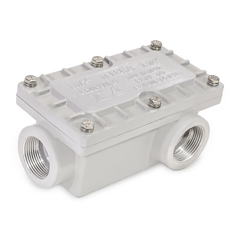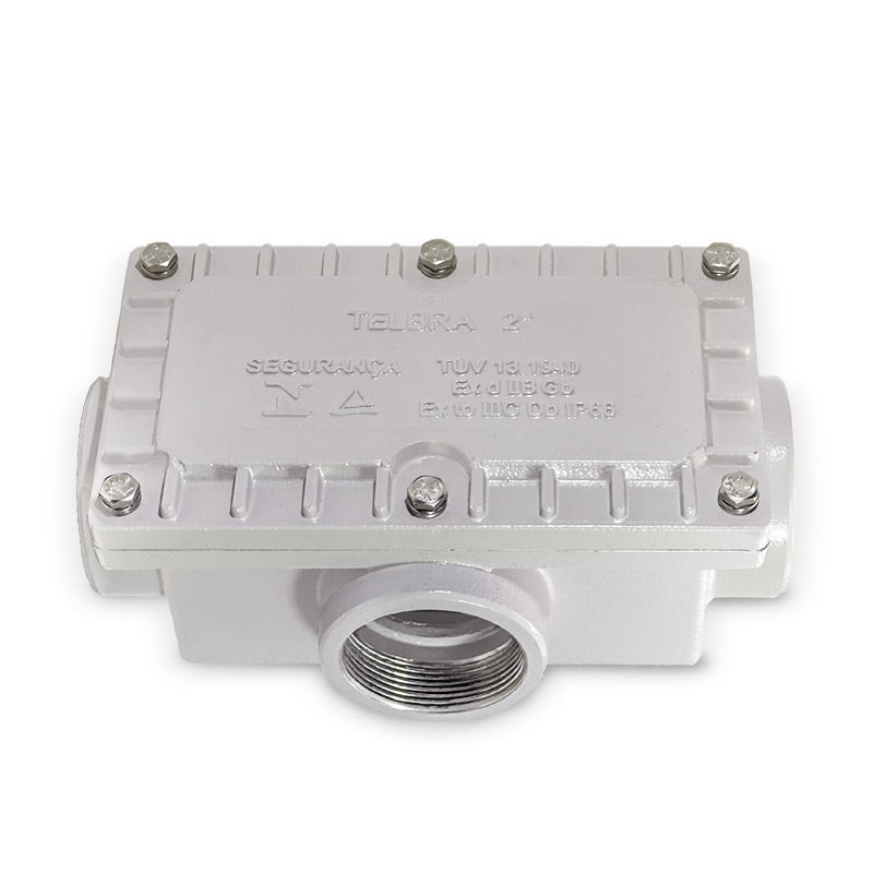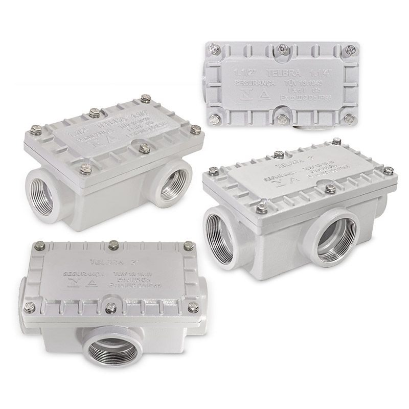 Características Construtivas Caixa de passagem à prova de explosão e à prova de poeiras combustíveis, fabricada em liga de alumínio fundido ou aço inox 304 ou 316, de alta resistência mecânica e à corrosão, tampa fixada ao corpo por parafusos de aço inox. Entradas rosqueadas de ½” a 4” NPT ou BSP. Acabamento Pintura eletrostática em poliéster de alta resistência à corrosão química, mecânica e à exposição solar, prolongando a vida útil do produto, na cor Cinza Munsell N6,5, (outras cores sob consulta).