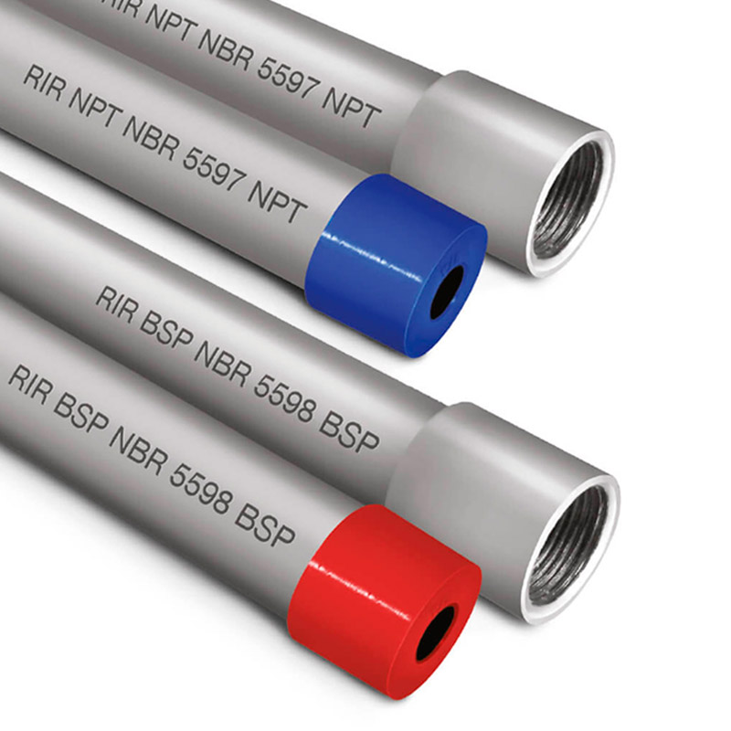 Eletroduto pesado, apropriada para instalações elétricas em áreas classificadas, fabricada em alumínio, aço carbono galvanizada (RR) rebarba removida ou aço inox. Fornecida com uma luva em uma extremidade e um protetor de rosca na outra extremidade em barras de três metros, de ½” a 4” com rosca NPT ou BSP. Utilizado na passagem de fios e cabos elétricos. Atende normas ABNT NBR 5597 (Rosca NPT) ou ABNT NBR 5598 (Rosca BSP).