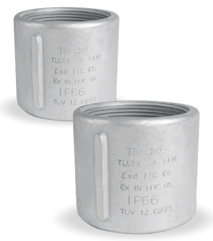 Características: Luva modelo TLUEX à prova de explosão “Ex d”, segurança aumentada “Ex e” e à prova de ingresso de poeiras combustíveis “Ex t”, apropriado para utilização em áreas classificadas como Zona 1, 2; 21 ou 22. Fabricado em alumínio fundido, alumínio laminado, ferro fundido galvanizado eletrolítico, ferro fundido galvanizado a fogo ou aço inox 304/316/316L. Podem ser fornecidos com rosca tipo NPT ou BSP. Grupos: Gases IIA; IIB ou IIC; Tipo de proteção Ex db; Ex eb. Poeiras combustíveis IIIA; IIIB ou IIIC; Tipo de proteção Ex tb. Aplicação: Na junção de peças com rosca externas com diâmetros iguais, acessórios, unidades seladoras, equipamentos elétricos Ex como: Luminárias, projetores, caixas de passagem, caixas de ligação, painéis, comandos, instrumentos, caixas de junção, botoeiras; Com tipo de proteção Ex d; Ex n; Ex e; Ex p.